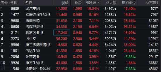 港股醫(yī)藥股全線走高,瑞爾集團漲超16%,歐康維視漲超9%