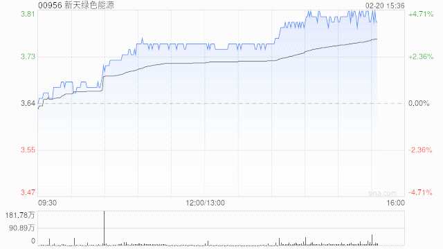 新天綠色能源(00956)溫和走高,午后上升4.67%,報3.81港元,成交額5948.51萬港元。