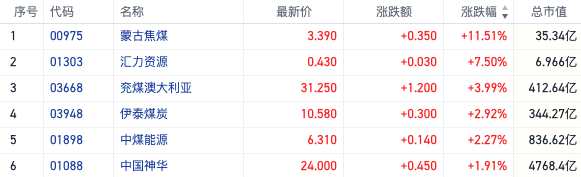 截至2月21日發(fā)稿,蒙古焦煤(00975.HK)領(lǐng)漲超11%、匯力資源(01303.HK)漲超7%,兗煤澳大利亞(03668.HK)漲近4%,伊泰煤炭(03948.HK)、中煤能源(01898.HK)均漲超2%、中國神華(01088.HK)跟漲。