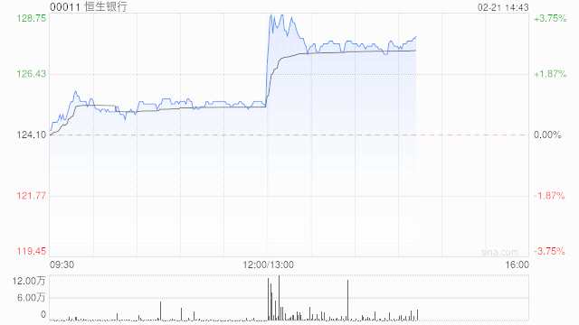 恒生銀行(00011)午后快速拉升,股價(jià)一度漲超4%,截至發(fā)稿,漲2.74%,報(bào)127.50港元,成交額1.77億港元。