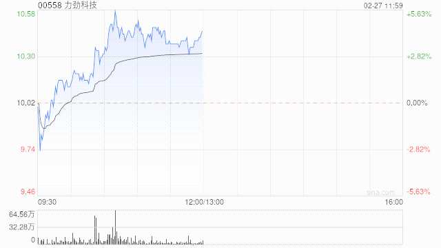 力勁科技(00558)早盤上漲4.39%,報10.46港元,成交額9731.819萬港元。