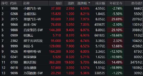 恒生科技指數(shù)暴漲5%,小鵬汽車、理想汽車、金蝶國際等漲8%,百度、明源云等漲7%,網(wǎng)易漲6.5%,騰訊漲近6%。