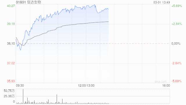 信達生物(01801)現(xiàn)漲4.46%,報39.80港元,成交額1.87億港元。