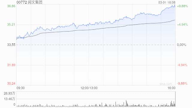 閱文集團(00772)顯著回升,臨近尾盤上升9.09%,現報36.60港元,成交額1.59億港元。