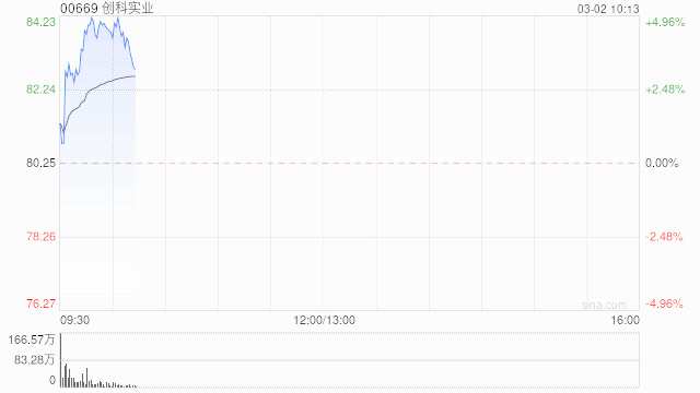 創(chuàng)科實業(yè)(00669)績后溫和回升,現(xiàn)漲4.42%,報83.80港元,成交額8.668億港元。