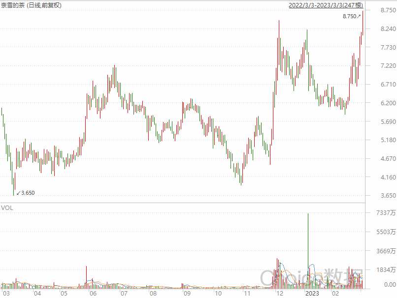 3月3日訊(編輯 胡家榮)受益消費(fèi)回暖,奈雪的茶(02150.HK)近期持續(xù)走強(qiáng)。截至午間收盤,奈雪的茶漲7.59%,創(chuàng)下近一年新高。