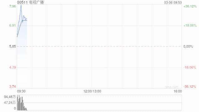 電視廣播(00511)上周五暴漲逾51%,今日早盤再漲27%,報(bào)7.43港元,成交額5729.209萬(wàn)港元。
