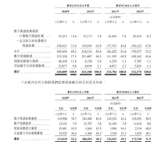 其中,數(shù)字閱讀推薦服務(wù)貢獻(xiàn)了公司逾一半的收入,數(shù)字營銷服務(wù)貢獻(xiàn)公司收入逾4成,兩者基本貢獻(xiàn)了公司98%的收入。