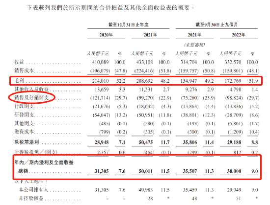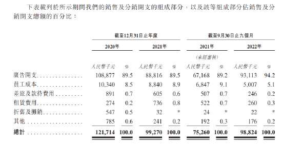 2020年、2021年及2022年前9個(gè)月,銷售及分銷開支分別為1.22億、0.99億、0.99億,其中,2022年前9月銷售及分銷開支大幅增加31.3%,且銷售及分銷開支占比近乎30%。在銷售及分銷開支中,廣告開支高達(dá)9成,分別為1.09億、0.89億以及0.93億,不到3年廣告砸了近3億。