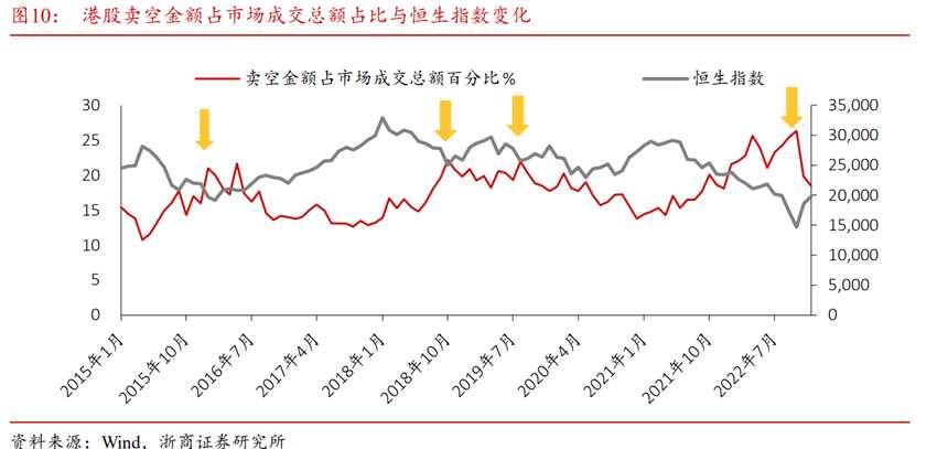 港股賣空成交金額占比一定程度上反映出市場的悲觀情緒,其拐點對港股走勢有一定指引意義。具體來看,在2016年Q1、2018年Q4、2019年Q4以及2022年Q4階段,隨著賣空金額占市場成交總額占比拐點向下,恒生指數(shù)均出現(xiàn)上漲行情,背后原因在于,港股賣空機制相對成熟,因此賣空金額占比反映出來的情緒面變化對市場走勢有一定預(yù)判的效果。