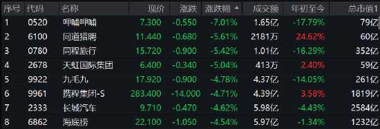 餐飲股大跌,呷哺呷哺跌超7%,頤海國際跌超7%,同程旅行跌超5%,九毛九、攜程、海底撈等跌近5%。