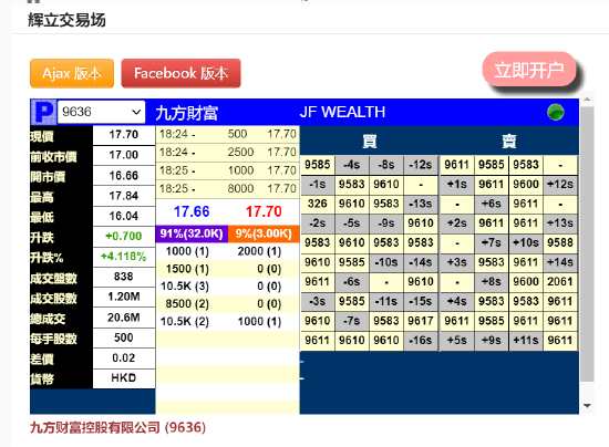 3月9日消息,九方財富明日掛牌港交所,今日暗盤上漲4.1%,報17.7港元,每手500股,不計手續(xù)費一手浮盈350港元。