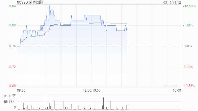 榮暉國際(00990)午盤上漲5.26%,報0.80港元,成交額1621.80萬港元。