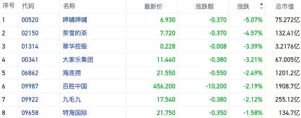 截至發(fā)稿,呷哺呷哺(00520.HK)跌超5%,奈雪的茶(02150.HK)領(lǐng)跌超4%,翠華控股(01314.HK)跌超3%,海底撈(06862.HK)、九毛九(09922.HK)、百勝中國(09987.HK)跟跌。
