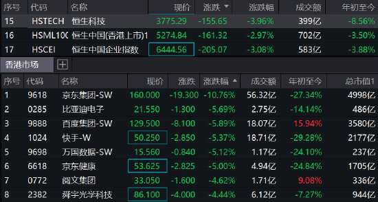 恒指科技指數(shù)尾盤跌幅擴(kuò)大至4%,京東集團(tuán)大跌11%