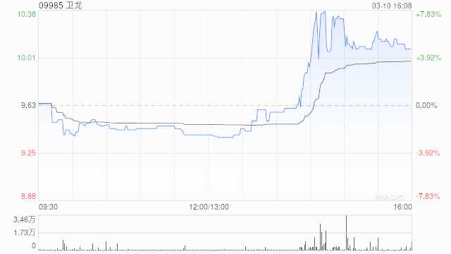 衛(wèi)龍(09985)臨近尾盤反彈,升4.67%,報10.08港元,成交額388.32萬港元。