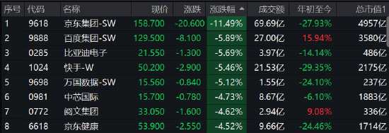 恒生科技指數(shù)大跌3.78%,京東跌11%,百度、比亞迪(002594)電子、快手等跌超5%,中芯國際、閱文集團(tuán)等跌近5%。