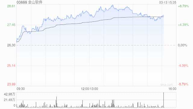 金山軟件(03888)明顯反彈,午后上升6.08%,報(bào)27.90港元,成交額3.05億港元。