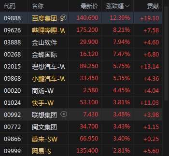 3月17日消息,恒生科技指數(shù)漲幅擴大至3%,百度漲超12%,嗶哩嗶哩漲超8%,快手漲3.81%,網(wǎng)易漲2.81%。