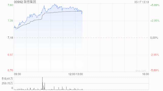 聯(lián)想集團(tuán)(00992)午盤再度活躍,上漲近5%,現(xiàn)報(bào)7.52港元,成交額2.97億港元。