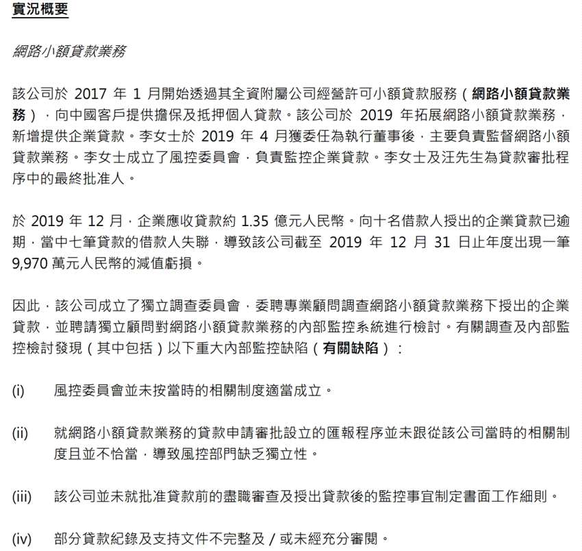 海投匯爆雷后,云游控股針對李魯一負責的小貸業(yè)務(wù)成立獨立調(diào)查委員會,調(diào)查發(fā)現(xiàn)了大量問題。據(jù)聯(lián)交所披露,在發(fā)放部分貸款時,公司有關(guān)人員曾提出多項問題,比如有借款人的財務(wù)數(shù)據(jù)是否準確、抵押憑證是否有效,并建議驗證借款人的財務(wù)數(shù)據(jù)。然而這些建議被直接忽略,貸款也順利通過審批。