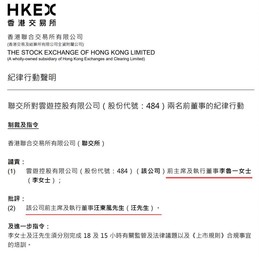 金融虎訊 3月17日消息,昨日晚間,香港聯(lián)交所發(fā)布紀律行動聲明,對游戲公司云游控股(00484.HK)兩名前董事李魯一和汪東風(fēng)進行譴責批評。原因是作為公司小貸業(yè)務(wù)的最終審批人,他們在已收到風(fēng)險提示的情況下,仍然批準多筆貸款,導(dǎo)致公司在2019年出現(xiàn)近億元減值虧損。按照要求,兩名董事須分別完成18小時、15小時有關(guān)監(jiān)管及法律議題以及《上市規(guī)則》合規(guī)事宜的培訓(xùn)。