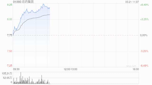 石藥集團(tuán)(01093)績前搶跑,上漲5.55%,現(xiàn)報8.18港元,成交額1.478億港元。