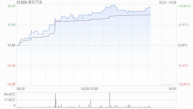 美東汽車(01268)明顯反彈,午后上升9.02%,報(bào)16.20港元,成交額3782.587萬港元。