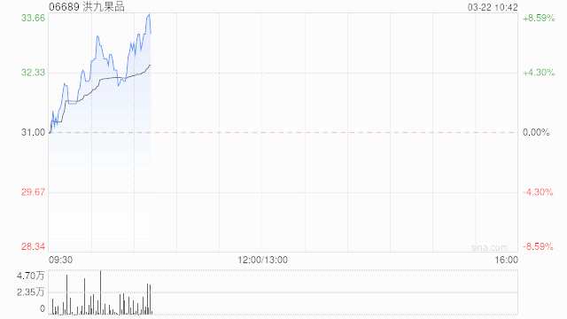 洪九果品(06689)繼續(xù)活躍,上漲7.09%,現(xiàn)報(bào)33.20港元,成交額1582.20萬(wàn)港元。