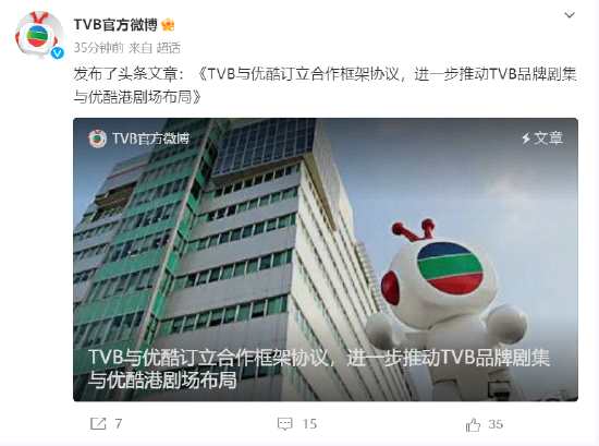 TVB官微發(fā)布消息,電視廣播有限公司(“TVB”或“本公司”)欣然宣布,本公司之附屬公司77工作室有限公司(“77工作室”)及上海翡翠東方傳播有限公司(“TVBC”)與阿里巴巴集團(tuán)旗下大型在線視頻平臺(tái)優(yōu)酷簽署合作框架協(xié)議,雙方將發(fā)揮各自優(yōu)勢(shì),達(dá)至協(xié)同效益。