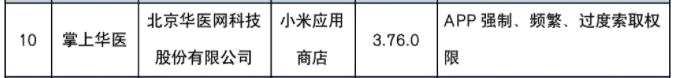其中,掌上華醫(yī)應(yīng)用開發(fā)者為北京華醫(yī)網(wǎng)科技股份有限公司,應(yīng)用來源為小米應(yīng)用商店,應(yīng)用版本為3.76.0,所涉問題為:APP強(qiáng)制、頻繁、過度索取權(quán)限。