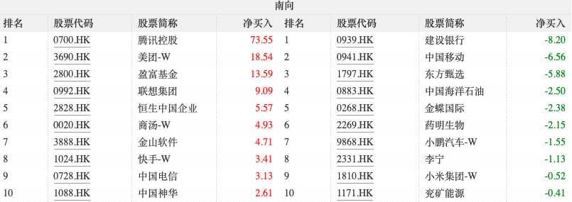 大幅凈買入:騰訊控股(00700.HK)10.70億港元;美團-W(03690.HK))2.75億港元;聯(lián)想集團(00992.HK)5.90億港元;商湯-W(00020.HK)1.48億港元;金山軟件(03888.HK)4.71億港元;中國移動(00941.HK))1.77億港元;中國電信(00728.HK)1.01億港元。