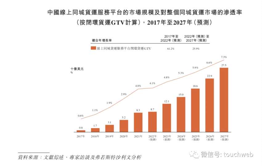 根據(jù)弗若斯特沙利文資料,2022年該市場GTV為2132億美元,預(yù)計(jì)2022年至2027年以12.1%復(fù)合年增長率增長;同時(shí)中國同城貨運(yùn)市場的線上滲透率仍處于較低水平,線上滲透率預(yù)計(jì)由2021年的4%提升至2027 年的7.3% 。