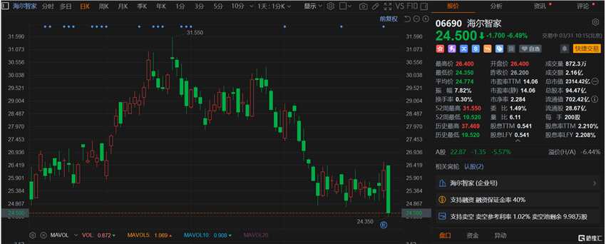 互聯(lián)網(wǎng)3月31日丨海爾智家(600690)H股跌超6%,報24.55港元刷新階段低價,A股跌超5%,報22.93元。