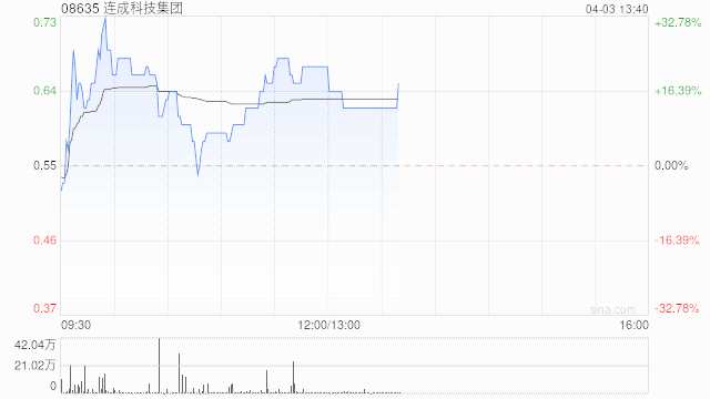 連成科技集團早盤一度大漲逾30%,高見0.73港元;午后回落僅漲12.73%,報0.62港元,成成交額257.328萬港元