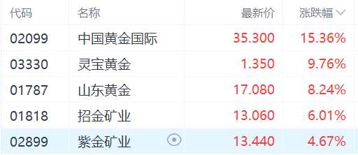 美國經(jīng)濟(jì)數(shù)據(jù)走弱令黃金股大漲 中國黃金國際漲超15%