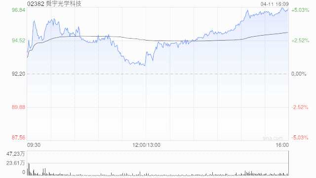舜宇光學(xué)(02382)尾盤上漲4.39%,現(xiàn)報(bào)96.25港元,成交額6.074億港元。