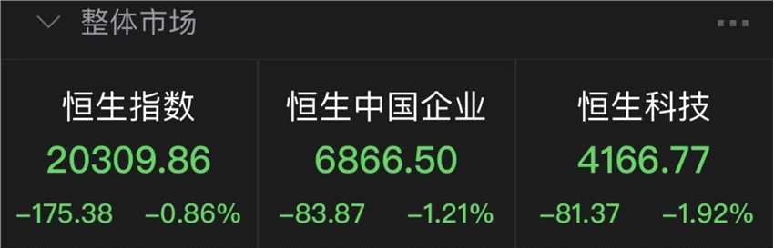 中新經(jīng)緯4月12日電 12日,港股低開低走,三大指數(shù)集體收跌。截至收盤,恒指跌0.86%報(bào)20309.86點(diǎn),恒生國企指數(shù)跌1.21%報(bào)6866.50點(diǎn),恒生科技指數(shù)跌1.92%報(bào)4166.77點(diǎn)。