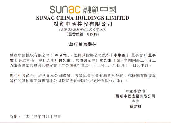 融創(chuàng)中國:遲迅先生及商羽先生因本集團內(nèi)部工作分工及職責調(diào)整的原因已提呈辭任本公司執(zhí)行董事。