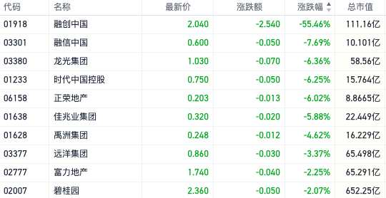 今日停牌已久融創(chuàng)中國(01918.HK)復(fù)牌大跌超55%,一度影響地產(chǎn)股情緒,收盤多只中小地產(chǎn)股跌幅均超3%。
