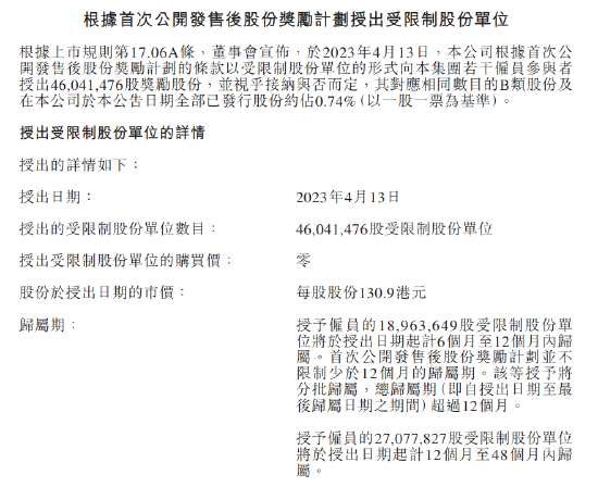 美團(tuán)集團(tuán)發(fā)布公告,向公司雇員授出4604萬股股份激勵計劃,按每股130.9港元,總價值60億港元,該等股份有半年至兩年不等的歸屬期。