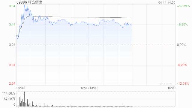 叮當(dāng)健康(09886)午盤上漲6.17%,報3.44港元,成交額5195.032萬港元。