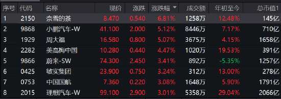 消費股集體走高,奈雪的茶漲6.8%,小鵬、周大福等漲超5%