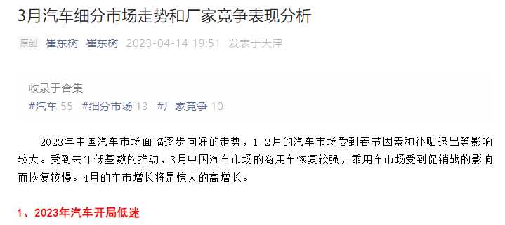 消息面上,乘聯(lián)會秘書長崔東樹4月14日通過個人微信公眾號發(fā)文稱,2023年中國汽車市場面臨逐步向好的走勢,1-2月的汽車市場受到春節(jié)因素和補貼退出等影響較大。受到去年低基數(shù)的推動,3月中國汽車市場的商用車恢復(fù)較強,乘用車市場受到促銷戰(zhàn)的影響而恢復(fù)較慢。4月的車市增長將是驚人的高增長。