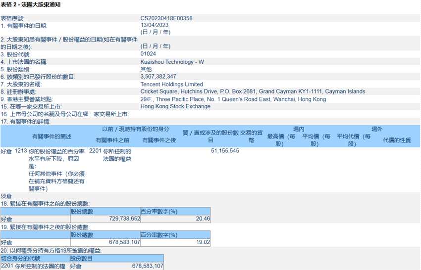 據港交所文件,4月13日,騰訊控股(00700)在快手-W(01024)的持股比例從20.46%降至19.02%。