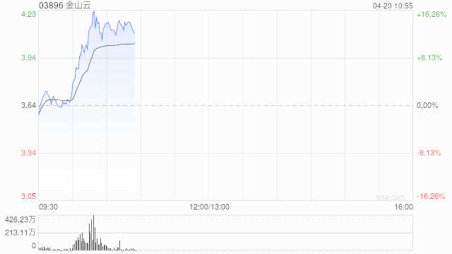 金山云(03896)早盤急升14.01%,報4.15港元,成交額2.034億港元。
