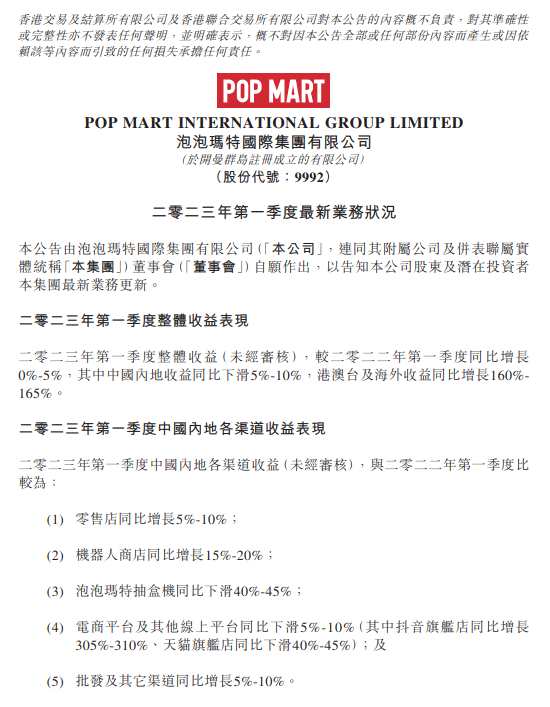根據(jù)泡泡瑪特在19日晚公布的2023年首季度業(yè)績預告,其中整體收入同比增長0%-5%,其中中國內(nèi)地收益同比下滑5%-10%,中國港澳臺及海外市場收入同比增長160%-165%。