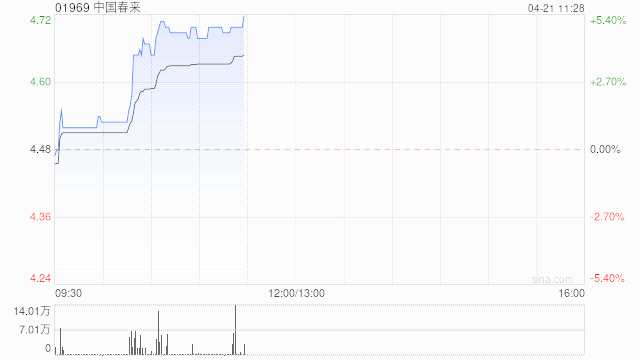 中國(guó)春來(lái)(01969)尾盤(pán)上漲5.36%,現(xiàn)報(bào)4.72港元,成交額564.049萬(wàn)港元。