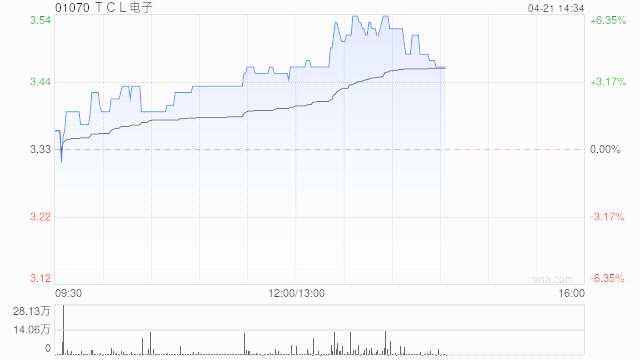 TCL電子(01070)午盤上漲6.31%,報(bào)3.54港元,成交額770.424萬(wàn)港元。