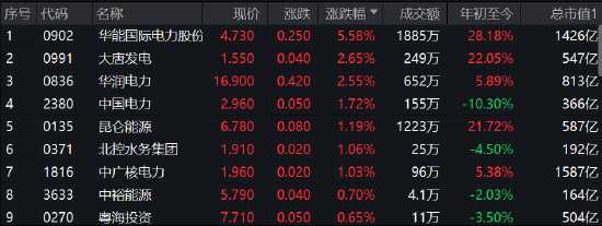 電力股集體走高,華能?chē)?guó)際電力漲5.58%,大唐發(fā)電、華潤(rùn)電力漲2.5%